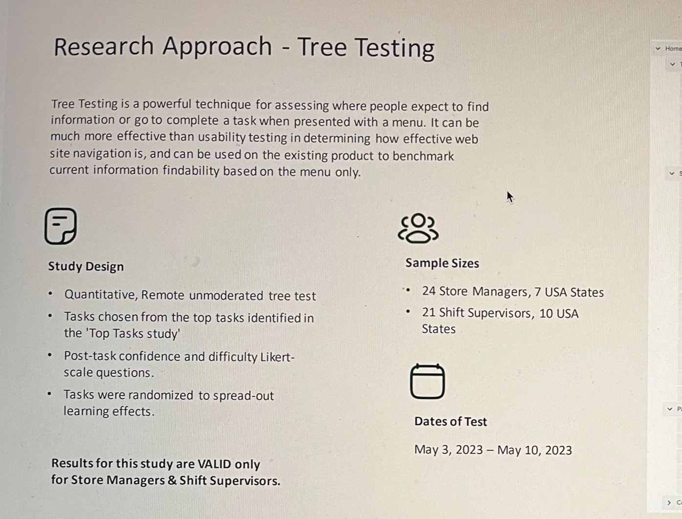 The team was interested in comparing the user experience of the redesigned product to the existing product, and quantifying improvements made on the information architecture and navigation. Goals included establishing a baseline for tracking the User Experience, laying a foundation for ongoing performance monitoring, allow the team to set Key Performance Indicators (KPIs), measure specific aspects of product to improve. I was the sole researcher completing all phases on this work, with stakeholder review and input. Thank you Jeff Sauro & MeasuringU.com for your pioneering work.